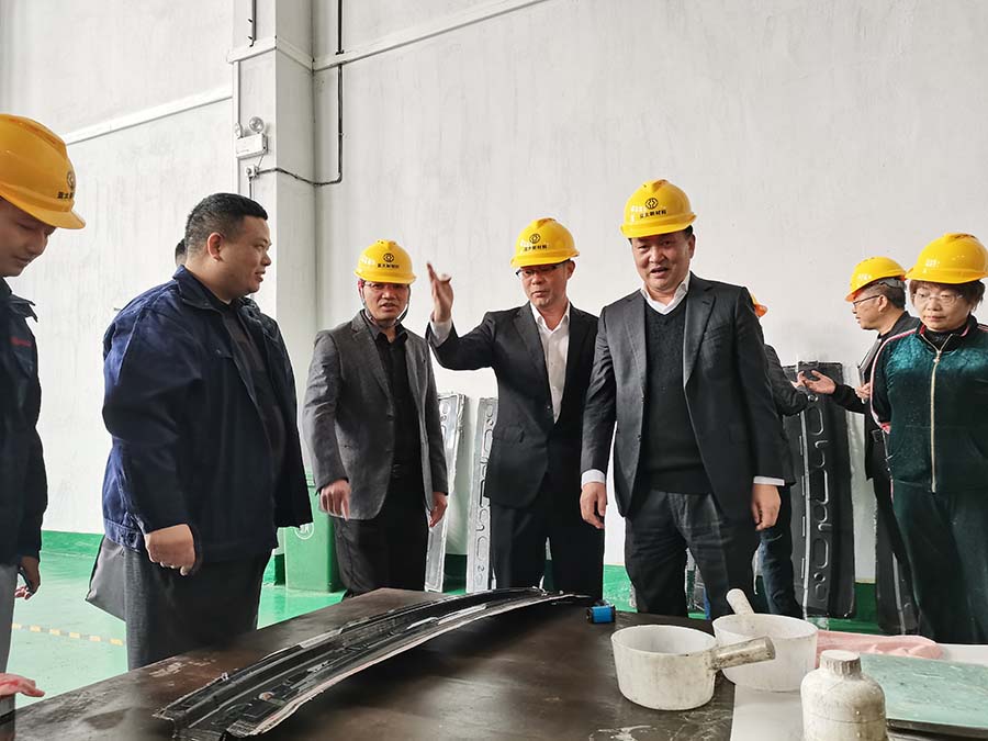 图:朱增余董事长(中间)向李伟忠市长(左一)介绍复合材料汽车零部件新研发成果李伟忠市长参观了产品展示厅、复合材料成型车间、产品试制过程,询问了产品的成型速度、核心技术,产品客户。