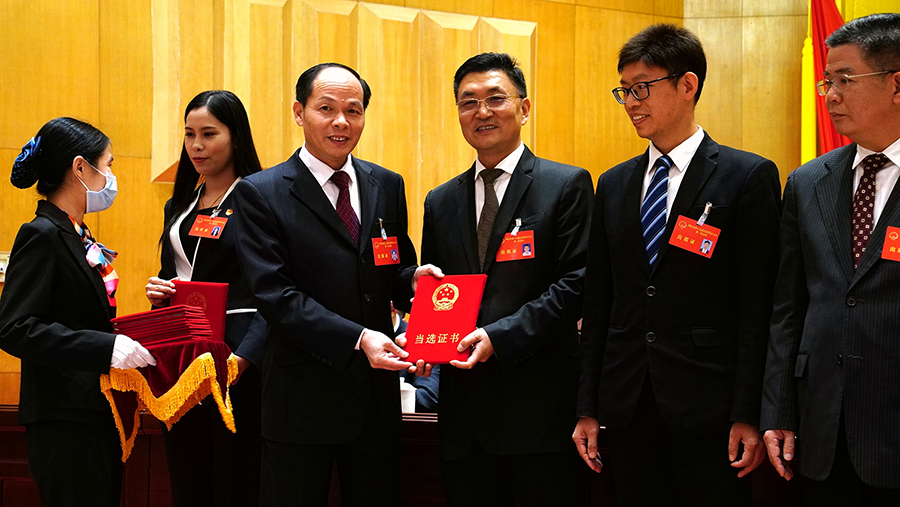 四会市人大主任梁祥达(左3)颁发当选证书给朱增余常委(右3)