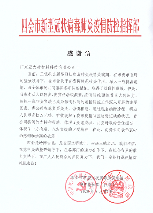 广东亚太公司捐款10万元支助四会市 中医院抗击新冠肺炎疫情阅读次数:905 | 发布日期:2020/2/27 | 作者: | 来源: